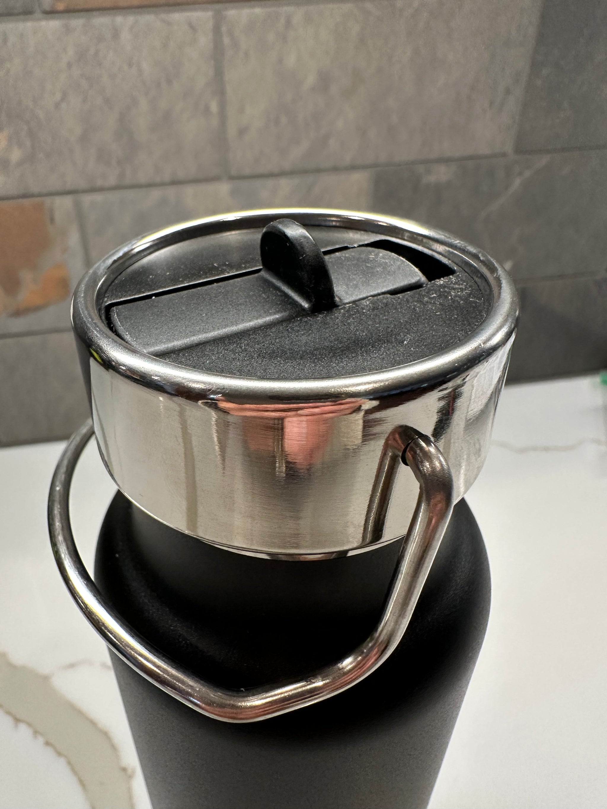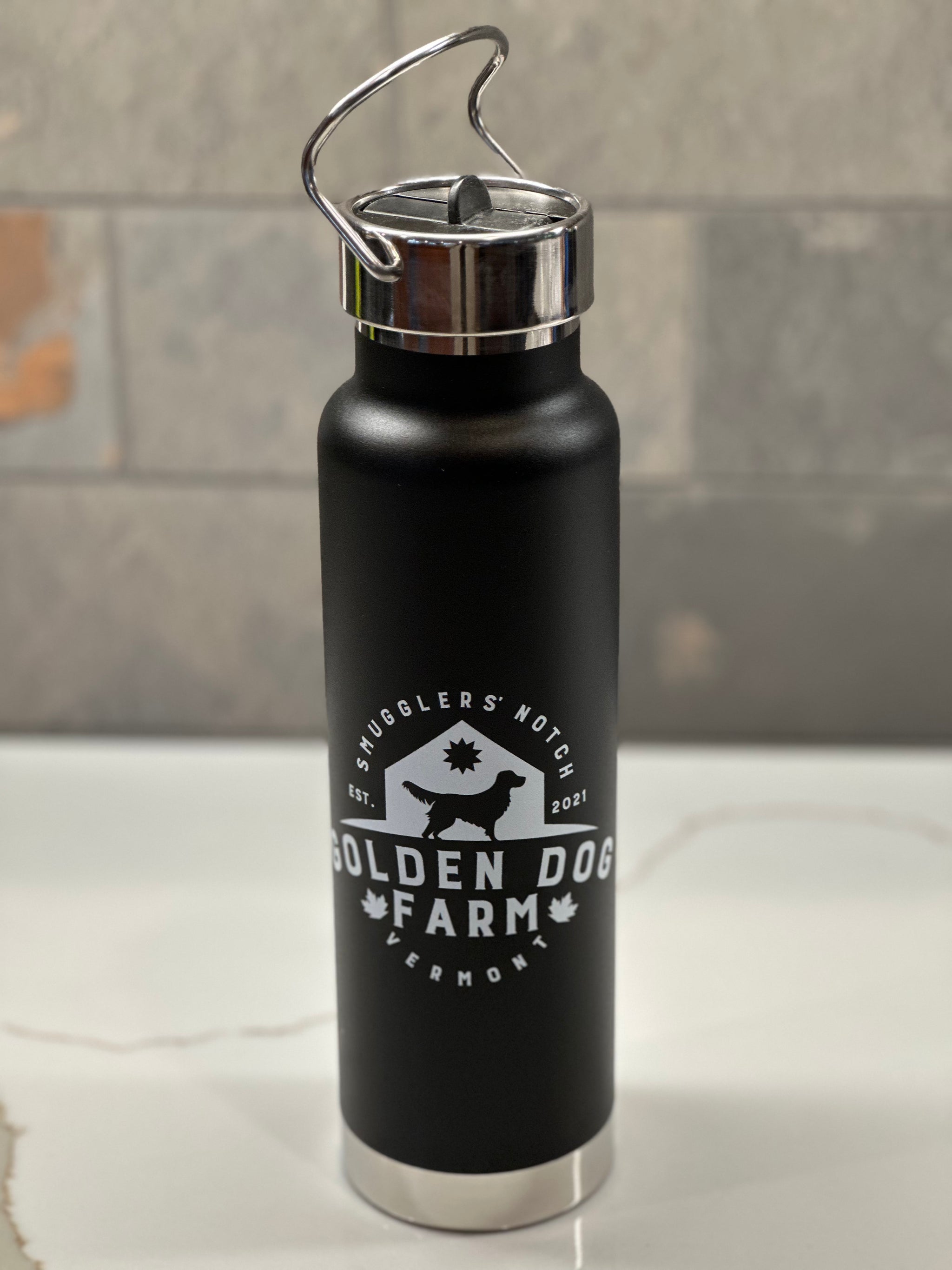 Like the unmatched views from the farm, our 25 oz water bottle doesn't disappoint. Its copper insulated double wall stainless steel vacuum construction prevents condensation and keeps beverages cold for 48 hours and hot for at least 12 hours! It has a stainless steel screw-on spill resistant lid with integrated straw, and a stainless steel fold-down hand loop for comfy carrying and convenience. Available in black with our Golden Dog Farm logo imprinted in white. Fits perfectly in most car cupholders.